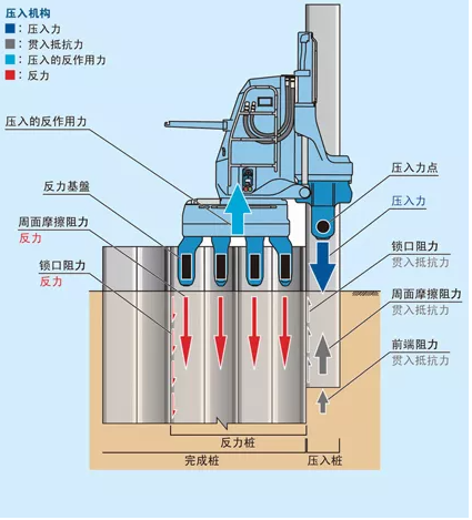 傳統(tǒng)樁工設(shè)備一般采用動能原理,通過沖擊、振動進(jìn)行施工。而日本株式會社技研制作所研發(fā)的靜壓植樁工法采用了獨特的靜壓原理,通過靜壓植樁機所提供的液壓力將樁材壓入地中。靜壓植樁機利用反力原理,通過夾住數(shù)根已經(jīng)壓入地下的樁材(完成樁)來獲取反力,利用液壓靜載荷將下一根樁材壓入地中。